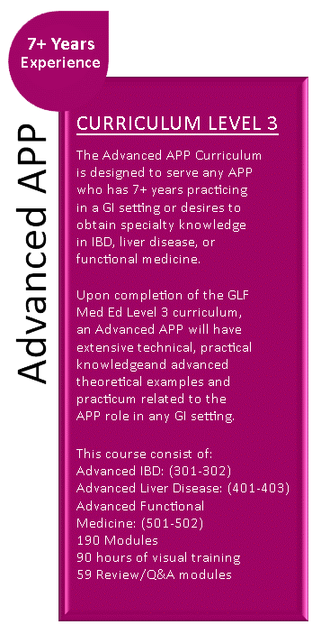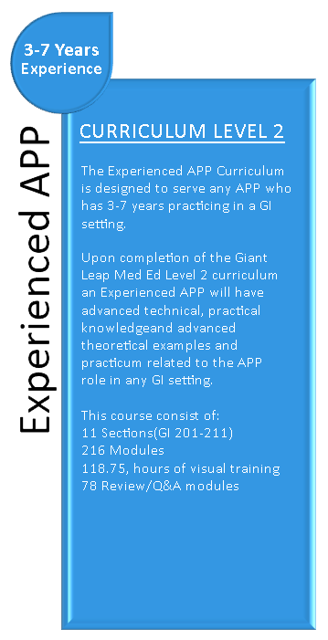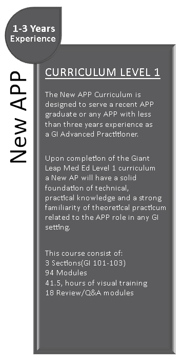 The Giant LEAP Foundation Medical Education Center offers three distinct levels of GI-specific curriculum for Advanced Practice Providers (APPs). The curriculum is designed to be based on the experience level of the individual Provider, however once enrolled, participants will have the ability to view and complete modules from any level of curriculum. To review the curriculum, click the “Content” tab above.